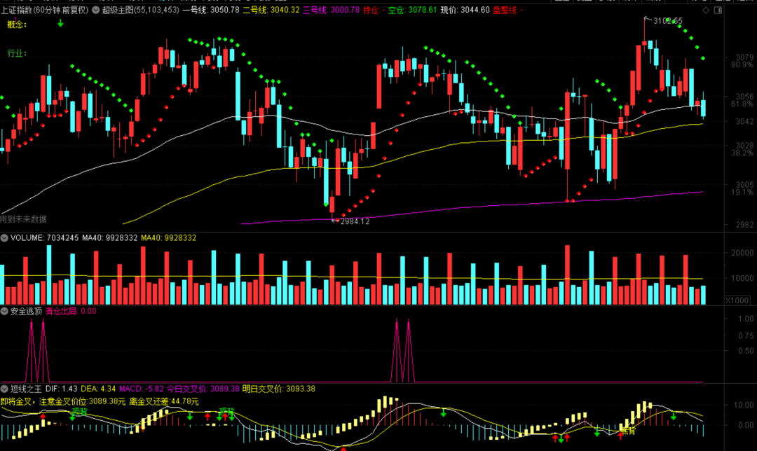 上一篇文章讲,沪指60分钟多空临界点在3060.30,今天前市最后一个小时K线跌破,下午反抽最高3055.86,然后又一根阴线破了下去。如此一来,小时级别大盘彻底翻为空头趋势,除非再度收复3060.30,或突破绿色多空转换点,否则小时级别大盘将会非常不乐观。当然,今天的回调也是一个小场面,只要日线级别没有太大问题,后续还有一定的希望!