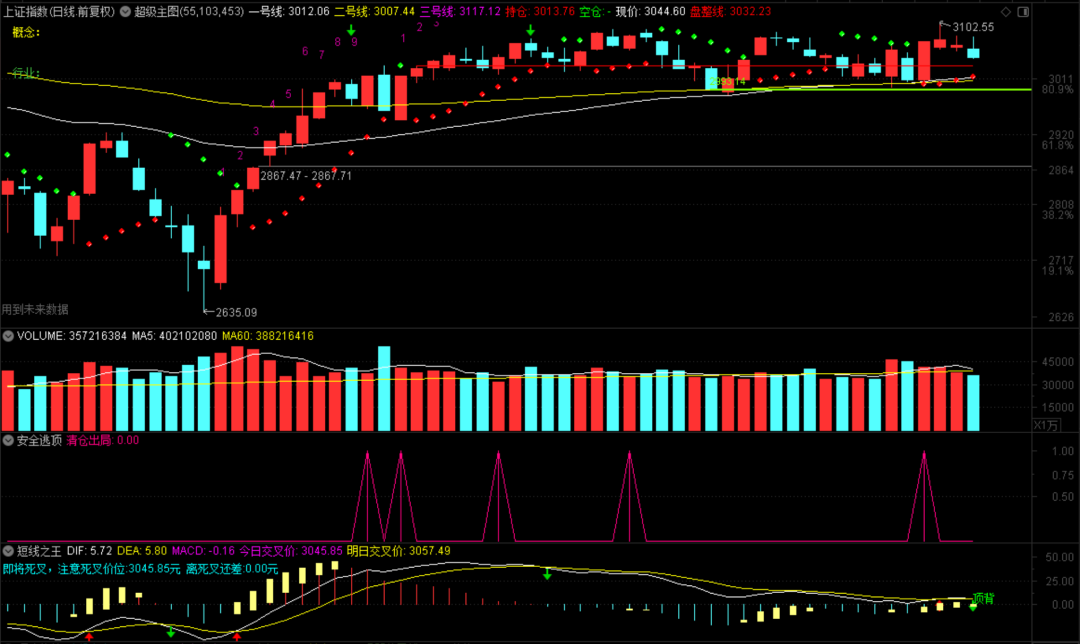 沪指收盘在3044.60,导致日线级别短线之王直接死叉,除非明天收盘在3057.49或之上,否则这样的死叉很难立即就化解。今天市场弱势格局非常明显,由于资金入场意愿不强,虽然看到国家队有护盘身影,但并没有抵住沪深两市主力资金的净流出。接下来,在多头情绪没有被进一步带动之前,整个市场不适合大仓位操作!