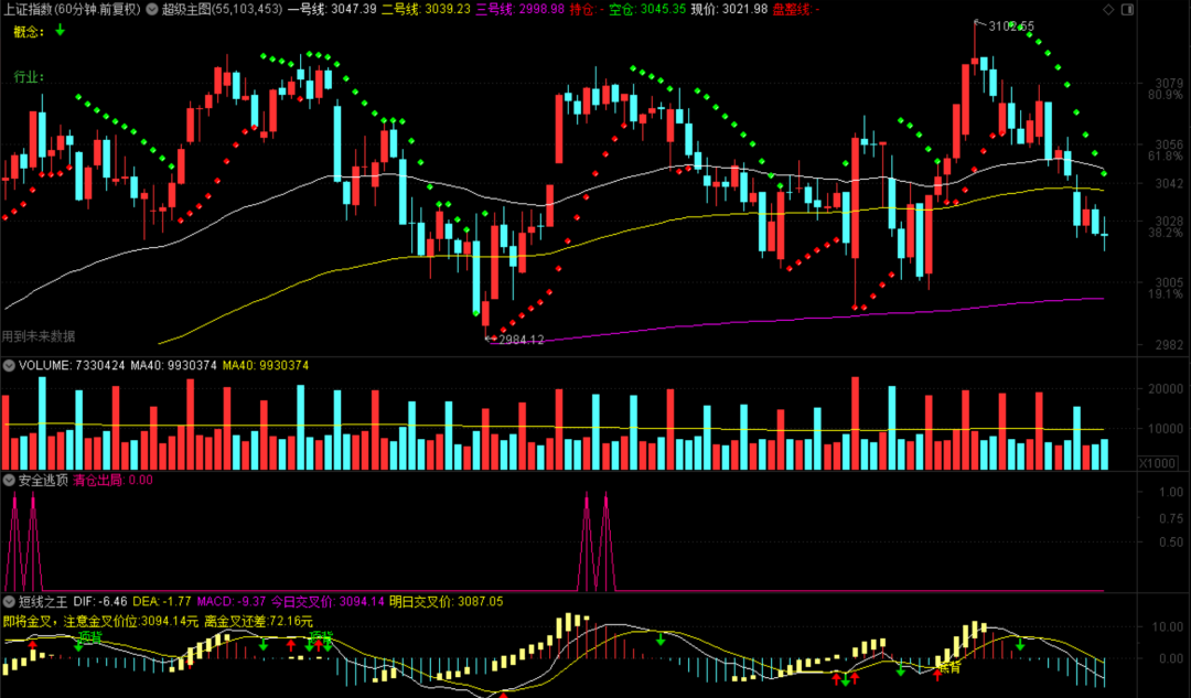 沪指60分钟多空临界点在3045.35,明天第1小时,如果能够有效突破的话,短线大盘还有进一步折腾的余地。否则,继续弱势震荡将不可避免。从60分钟顶底绝技指标来看,目前小时级别已经处于相对低位,需要有消息面或资金面的配合,指数才有拉起来的可能!