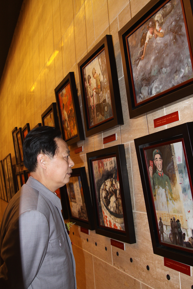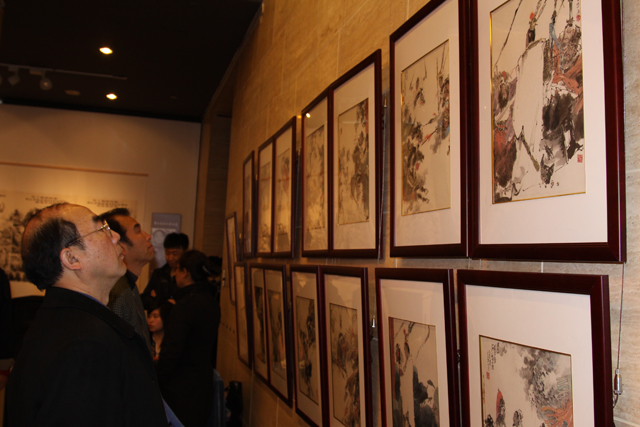 书画爱好者在汪国新《三国演义》题材作品前驻足欣赏。