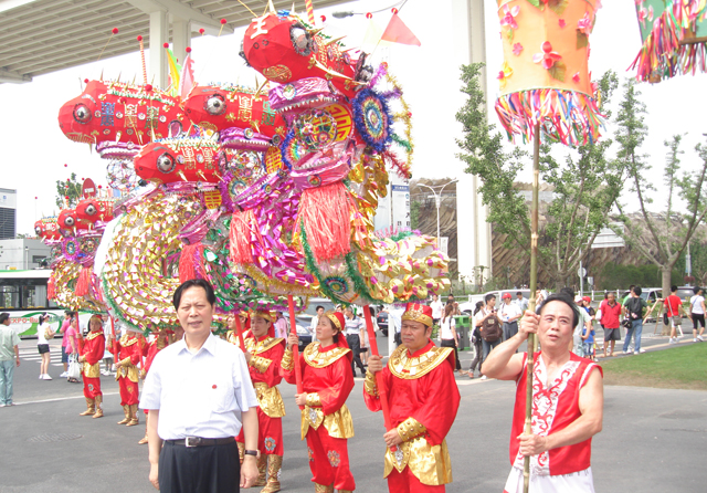 图为全国政协委员、诗书画家汪国新在“上海活动周”的舞龙表演者队伍中间,心情很受感染,融入一团喜悦之中。