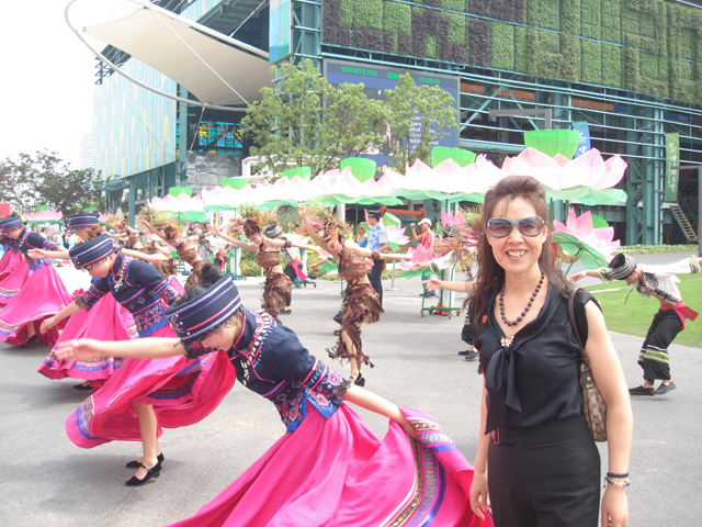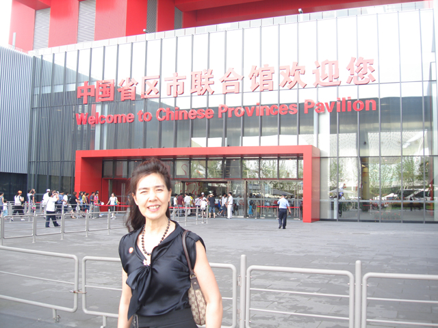图为中华海外联谊会常务理事郑桂兰女士在中国省区市联合馆前。