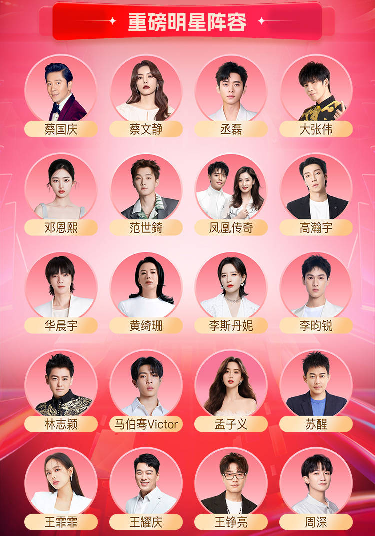 湖南卫视《2023天猫双11惊喜夜》晚会主持阵容:何炅、汪涵,沈梦辰、李莎旻子、齐思钧、吴泽林、靳梦佳,此外还有刘烨、谢娜、关晓彤、王耀庆、蔡国庆。