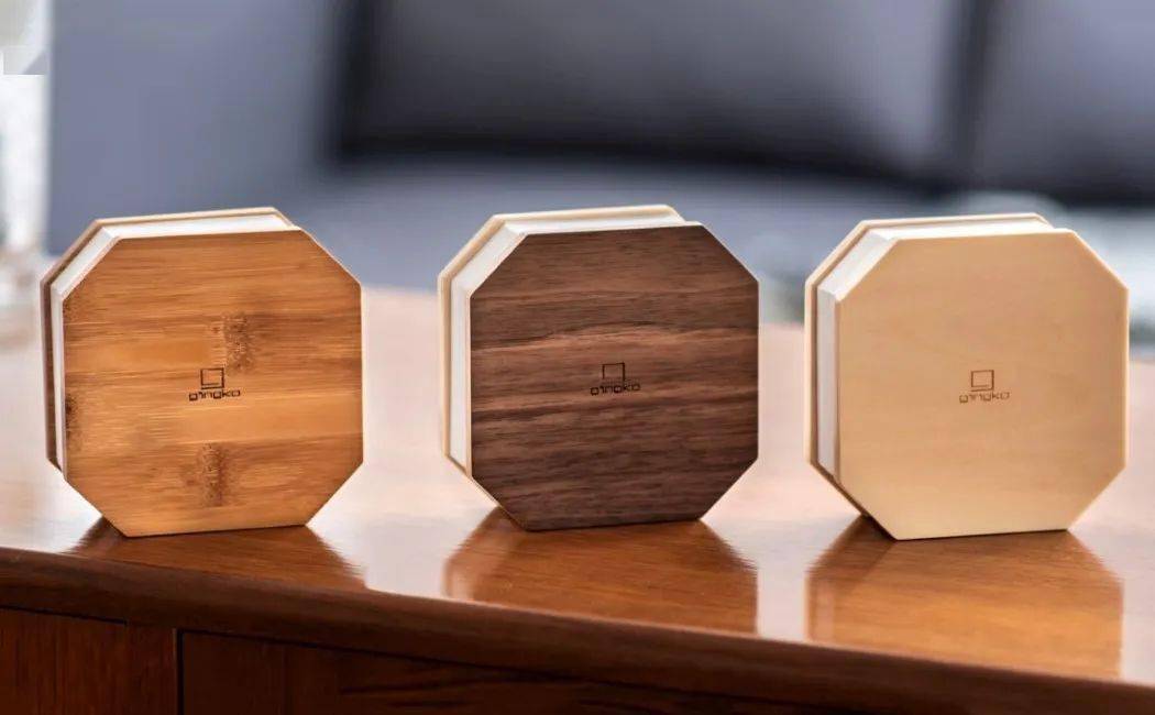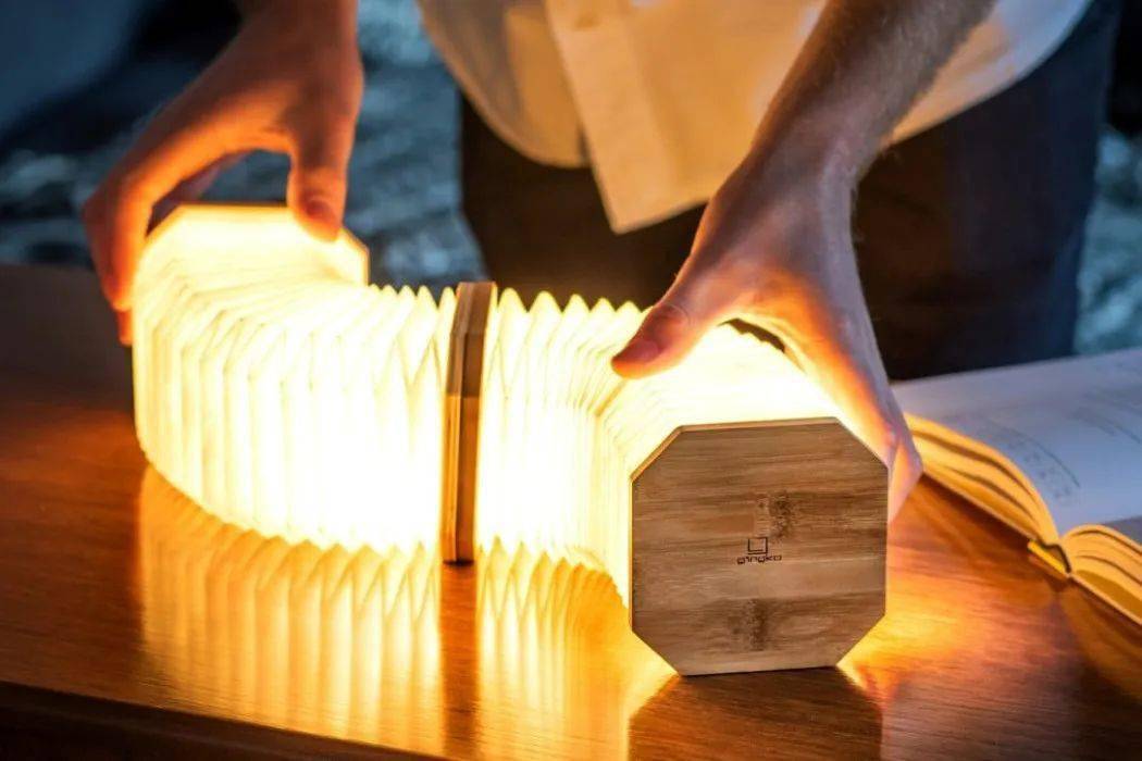 Accordion Lamp提供3种木材选择——竹、胡桃木和枫木。除了容纳磁铁外,木制面板还包含Accordion Lamp的LED以及1600mAh可充电电池,充满电后可提供6-8小时的照明。