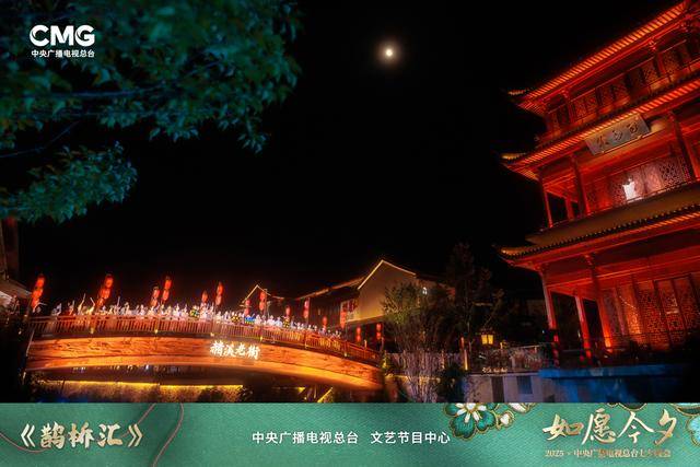 《2025年中央广播电视总台七夕晚会》不仅是一次传统节日的当代演绎,更是一次天台魅力的全景展示,让观众看到天台的山水不仅是风景,更是承载“圆满”的文化符号。该晚会把家国和平的愿景融入节目中,融媒体短片《隔空合影——爱在战位旁》展现的军旅夫妻深情,与天台“和合文化”中“小家和合、大家安康”的理念相通,让“愿”既有个人温度,也有地方文化的深度。该晚会打破传统中心舞台局限,以“带状临河场景”构建沉浸式体验,让天台的景致与节目深度交融,比如歌曲《鹊桥汇》中,前奏响起时刘建福扮演的“李白”现身赭溪老街司马阁吟诵“龙楼凤阙不肯住,飞腾直欲天台去”,既呼应天台“浙东唐诗之路”目的地的身份,又为晚会注入文化厚重感。该晚会通过“龙梭寻巧”的线索,把各“巧艺”进行串联,实则是对中华非遗文化“薪火长明”的致敬,彰显地方对传统文化的守护与创新。