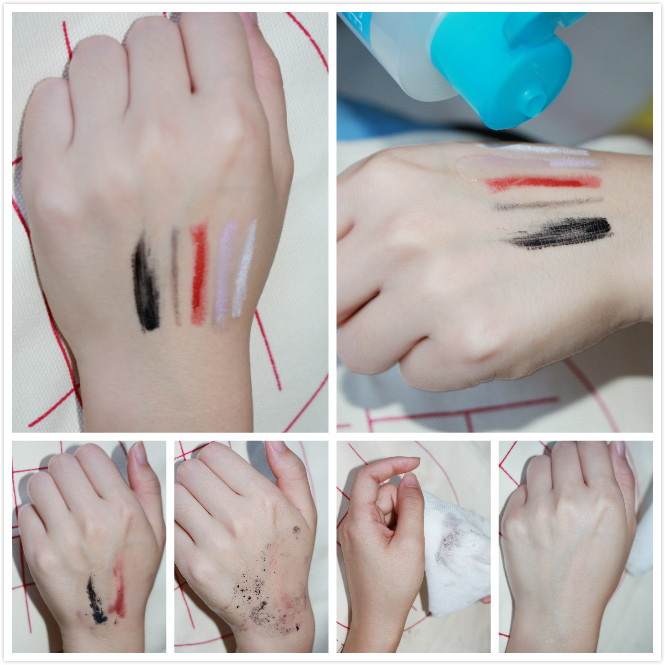 倾倒少量洁肤水,就可以看到彩妆产品被稀释了,随后按摩即清理干净了,效果立杆见影,同时手背还水润润的,一点也不会油腻干燥。