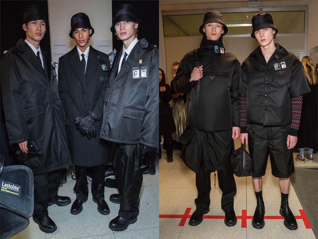 在Prada的秀场上,带有工业感和实用性的尼龙优雅地被再次应用到服装上,这次秀在米兰东南郊区的“Prada仓库”旁边举行,更像是在一所物流中心举行。