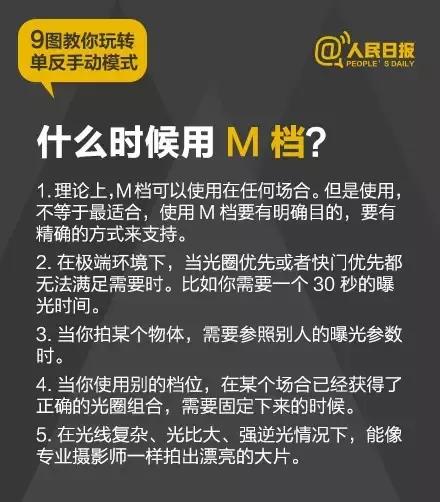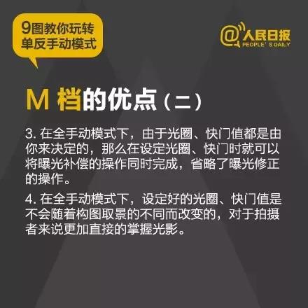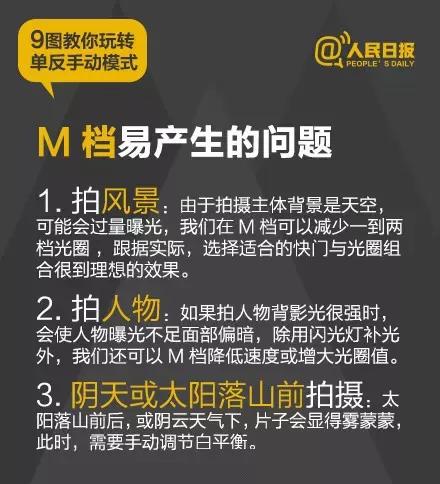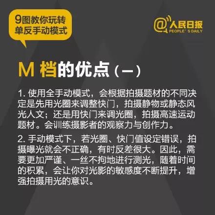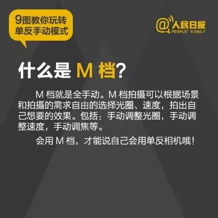 M档是指全手动相机功能转盘上所具有的一个档。除此之外,全手动相机的功能转盘上还具有P、A、S档。 一般数码相机对P,A,S叫做部份手动功能,而M才称作全手动功能。用M档拍摄可以根据场景和拍摄的需求自由的选择光圈、速度,拍出自己想要的效果。但用M档拍摄并非简单的将相机调整到M的位置就行了,而是要用真正意义上的全手动,它包括:手动调整光圈,手动调整速度,手动调焦等。为了更好的使用好M档拍摄,就自己的理解谈谈拍摄中所要注意的一些问题。http://n1.itc.cn/img8/wb/smccloud/2015/06/10/143390432632503504.JPG