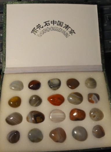 游轮上的文艺汇演的抽奖奖品已全部准备好,这是三等奖南京云锦、四等奖南京雨花石——