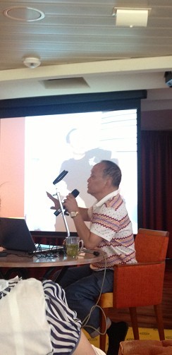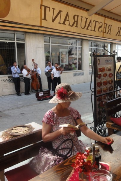 这,也是我抓拍的,在斯洛伐克首都的街上;草帽上扎着花朵的美女在娴静地看书;音符在书本的字里行间起劲地跳跃、流淌;多么美的诗情画意啊!
