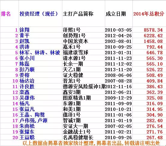 除了这三位,揭幕者独家制作的2014年度《中国阳光私募基金经理能力榜》的最大看点是,诞生了不少新面孔,榜单前20名见下图表: