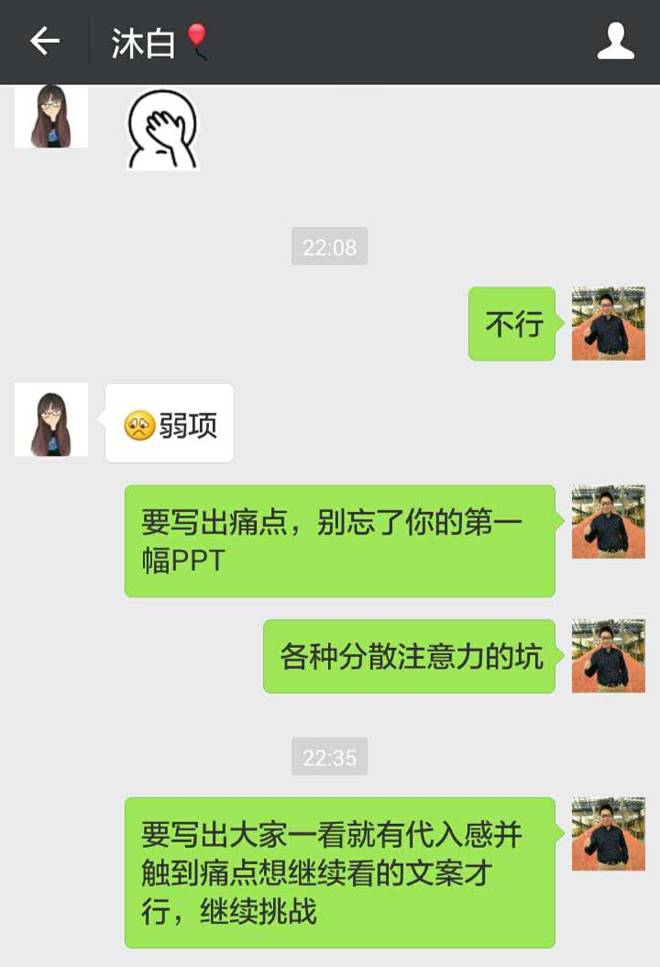 我要她为自己的PPT配微博文案,我来看,做好了文案我来转发她的微博,她欣然受虐。