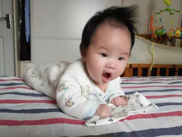 竖起来,果然不哭了,马上对你笑,张开嘴没心没肺,头立不住,一头撞到你胸口,等扶起来,已经是给你胸前沾了一大块口水。