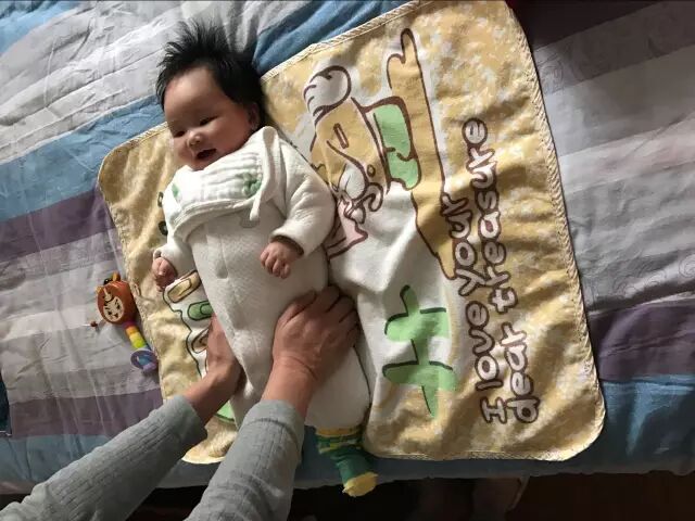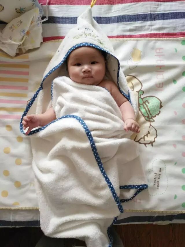 她喜欢洗澡,享受得很,洗完赶紧用毛巾被裹到开了空调的房间。我把她裹得像个小活佛,简直太可爱了。