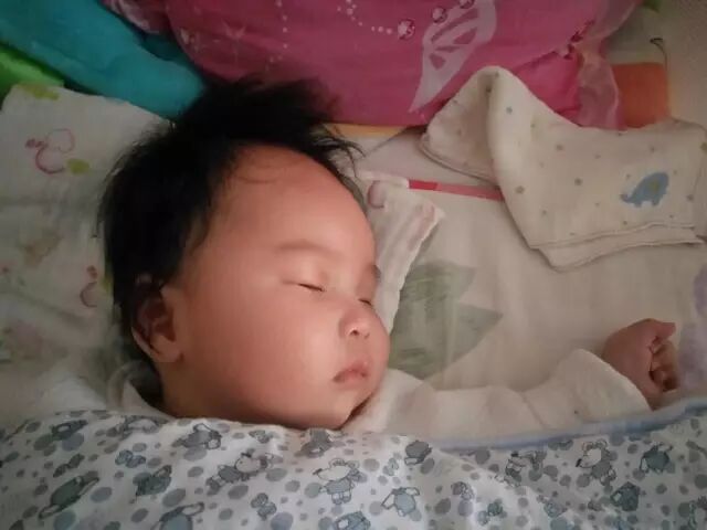 终于沉沉睡去,小心放在小床上,手脚还会猛然一抽,但没事,盖上小棉被,给我的小棉袄。