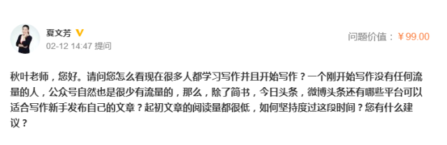 比如我做微博问答,肯定是进行了系统思考,加上我想快速测试一下这个平台,如果我花了1个小时写了近3000字干货就为了挣99元钱,我也很难坚持回答大家的问题,因为性价比很低。