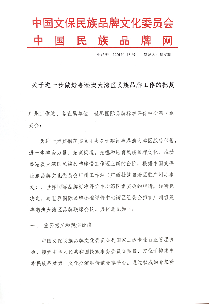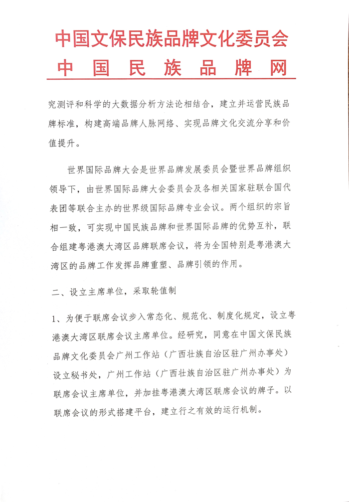 为进一步贯彻落实党中央关于建设粤港澳大湾区战略部署,进一步整合力量、拓宽渠道,挖掘和培育民族品牌文化,推动粤港澳大湾区民族品牌建设工作迈上新的台阶,根据中国文保民族品牌文化委员会广州工作站(广西壮族自治区驻广州办事处)、世界国际品牌标准评价中心湾区组委会的申请,经研究决定,与世界国际品牌标准评价中心湾区组委会拟在广州组建粤港澳大湾区品牌联席会议。具体意见如下: