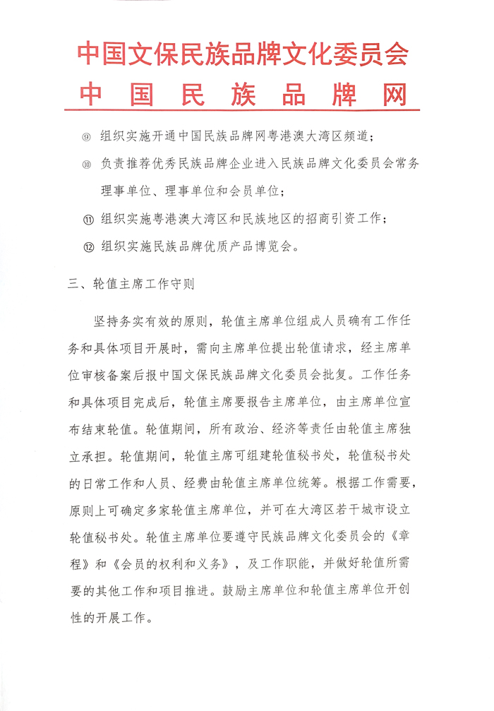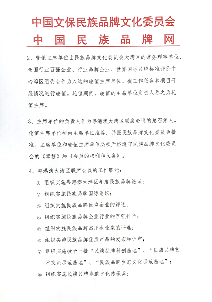 2、轮值主席单位由民族品牌文化委员会大湾区的常务理事单位、全国行业百强企业、行业品牌企业、世界国际品牌标准评价中心湾区组委会作为入选的轮值主席单位。视工作任务和项目开展情况进行轮值。轮值期间,轮值的主席单位负责人称之为轮值主席。