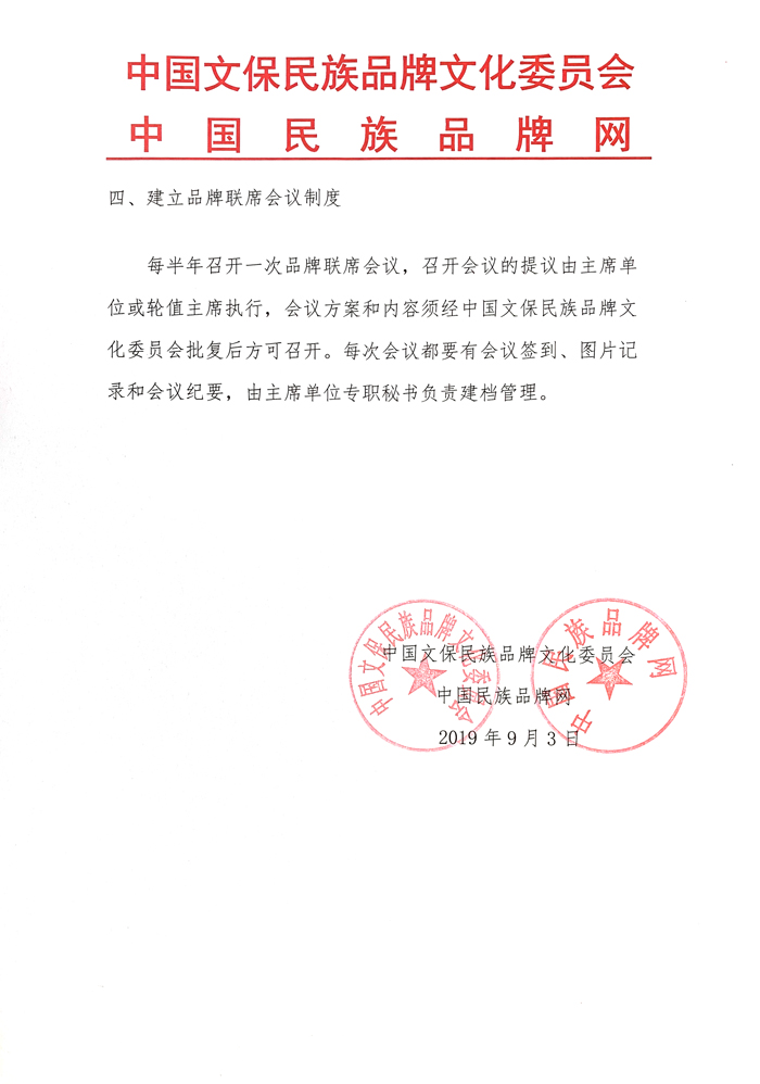每半年召开一次品牌联席会议,召开会议的提议由主席单位或轮值主席执行,会议方案和内容须经中国文保民族品牌文化委员会批复后方可召开。每次会议都要有会议签到、图片记录和会议纪要,由主席单位专职秘书负责建档管理。