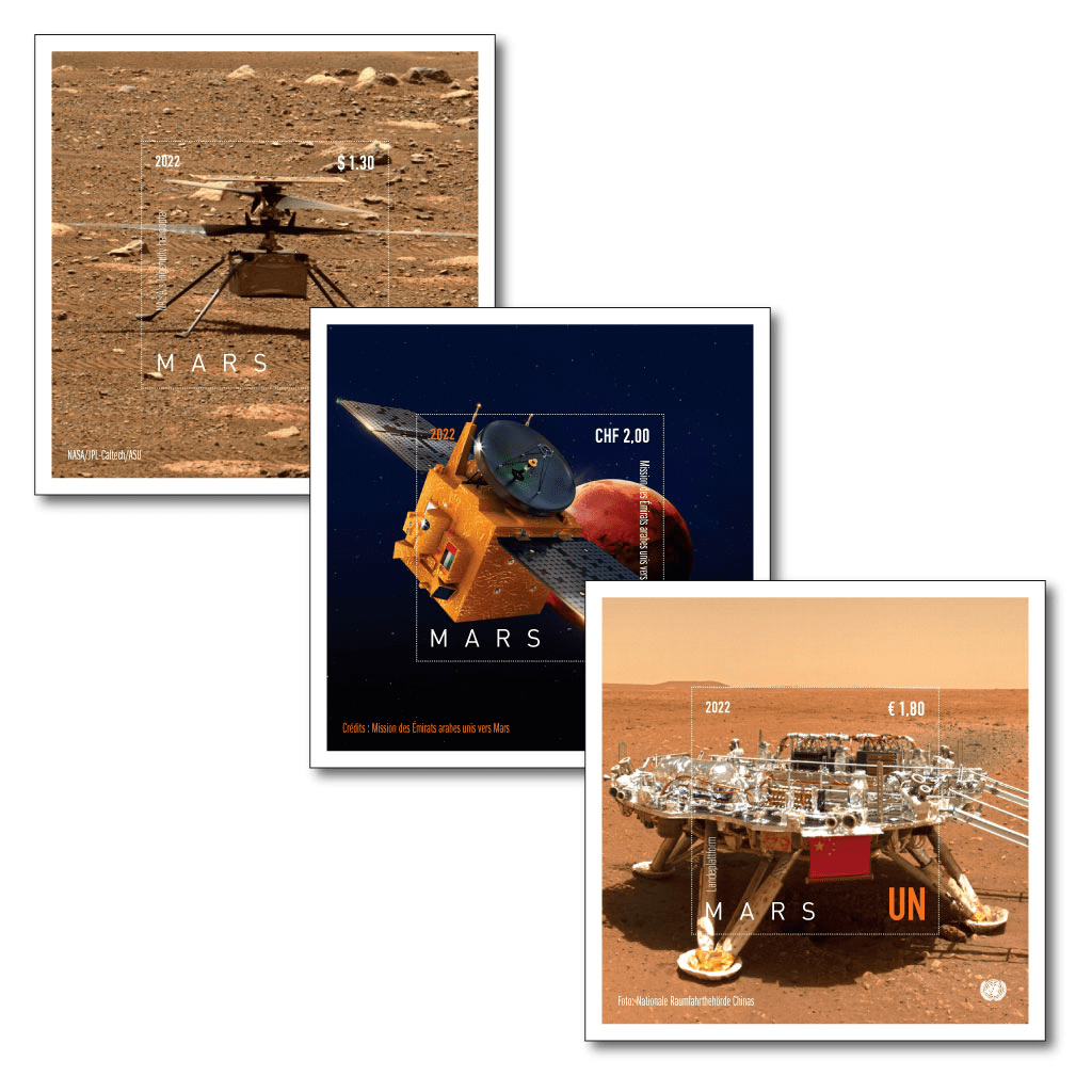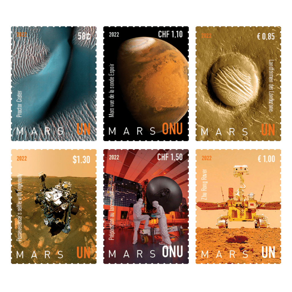 2022年4月24日,联合国邮政发行《火星》邮票一套6枚和小型张一套3枚,以纪念人类探索火星取得的成就,邮票内容介绍了中国、美国和阿拉伯联合酋长国在火星探索领域取得的成就。联合国维也纳办事处发行的主题为:《天问一号预选着陆区地貌》《祝融号火星车》《祝融号着陆平台》;联合国日内瓦办事处发行的主题为:《希望号探测器拍摄的火星》、《阿联酋火星探测器“准备发射”》和《阿联酋希望号探测器》;联合国纽约办事处发行的主题为:《火星普罗克特陨石坑》、《“火星2020”项目毅力号火星车》和《“火星2020”项目机智号直升机》。这套邮票由联合国邮政的Sergio Baradat设计。