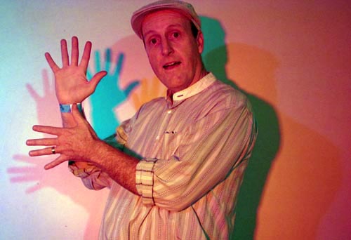 Note that the cast shadows behind my raised hand and my head are magenta, cyan, and yellow. The yellow shadow on the far right is cast by the blue light. It’s yellow because it is lit by a mixture of green and red. In the realm of light, as opposed to pigment, green and red mix to make yellow.