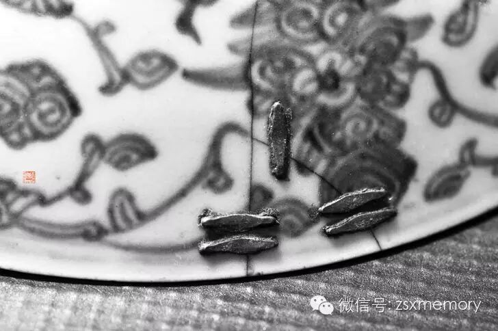 图--5:青花缠枝莲纹瓷碗上的锔钉。