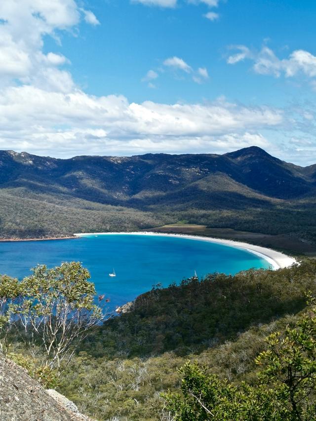 澳大利亚的酒杯湾Wineglass Bay是我们到达塔斯马尼亚当天就拜访的景点。从停车场徒步40分钟登上观景台,山上的微风让人心旷神怡。凝视下面清澈无垠的蓝色海湾,银白色的沙滩正如酒杯的边缘一样完美无瑕,没喝酒就美醉了。