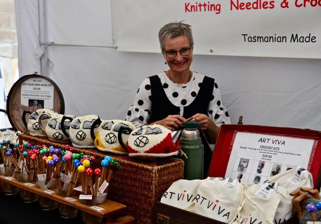 澳洲是个盛产羊毛的国度,编织业很发达,各种纯手工编织的摊位有很多特色编织品。这家女摊主手里一边忙着编织着帽子,一边随时和来往的客人打着招呼。
