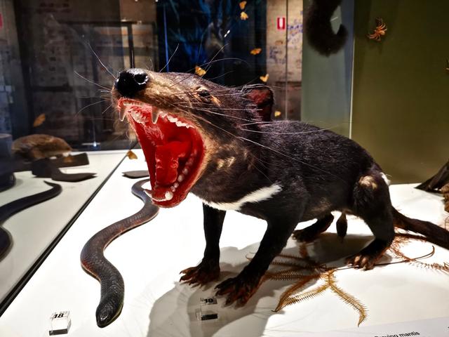 里面有好多的动物标本,除了平时常见的考拉袋鼠鹦鹉外,不常见的是澳洲特有的鸭嘴兽,当然还有题图那个有着澳大利亚魔鬼之称的“塔斯马尼亚恶魔”。