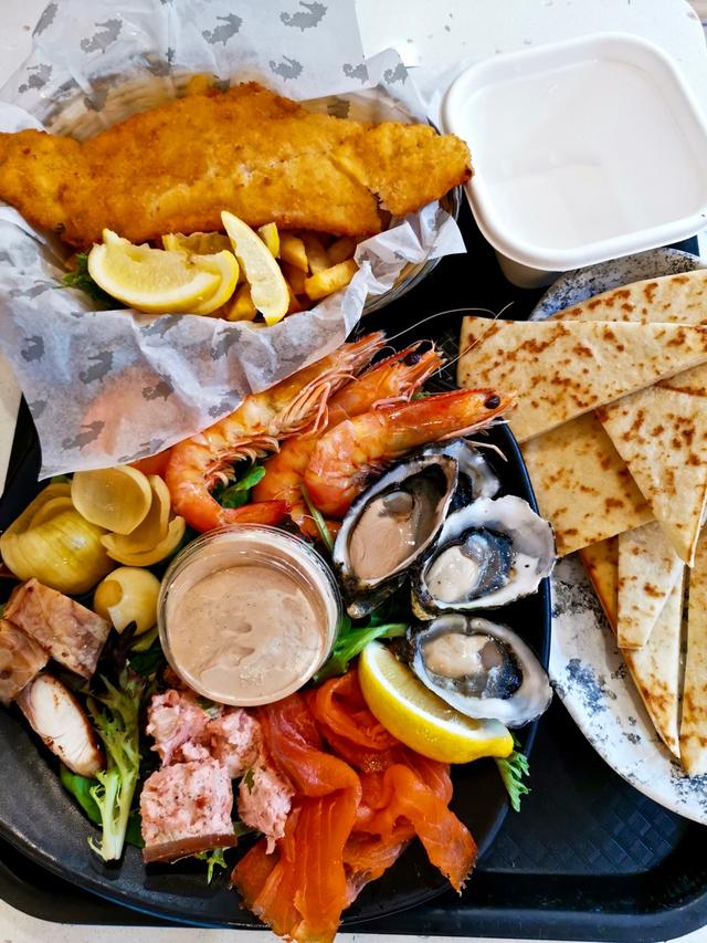 走累了,也到了午饭时间,正好逛到了码头海鲜大棚,我们俩人要了啤酒,一大盘海鲜,怕不够又点了一份Fish & chips,结果是又吃撑了。