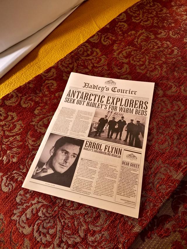 塔斯马尼亚之旅我们选择了一家被列入遗产名录的酒店,想好好感受一下古典风。进到房间就看到了床铺上旧报纸风格的酒店光荣往事,古典风扑面而来!