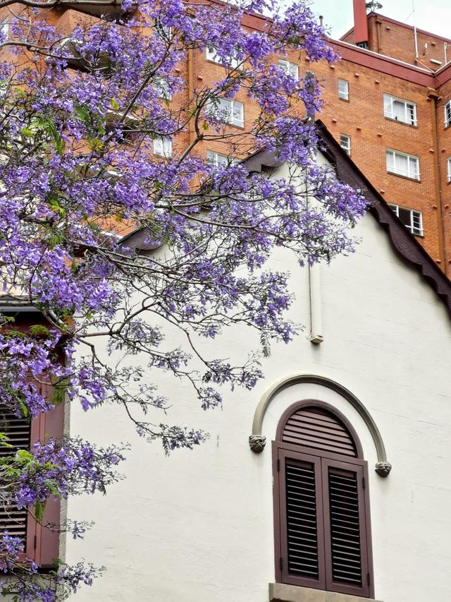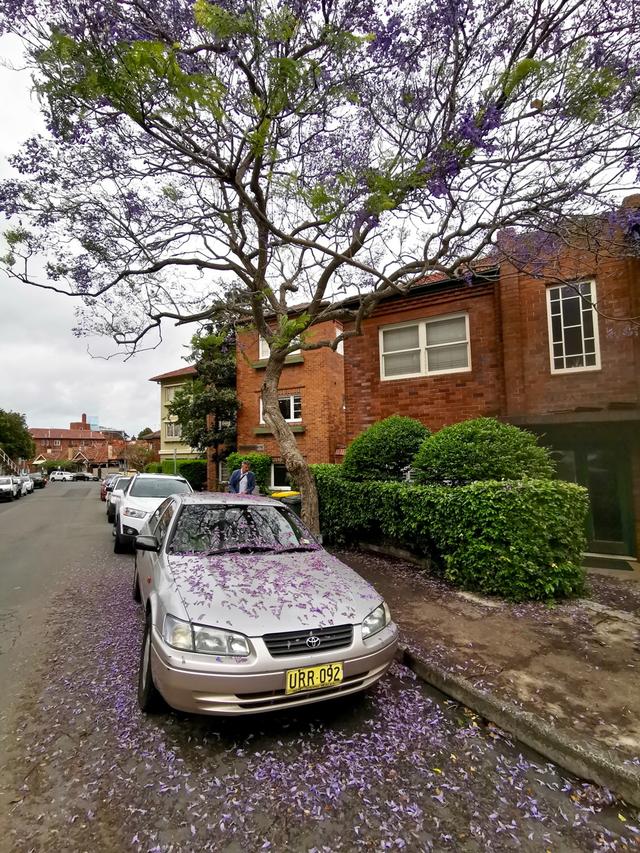 蓝花楹的花期就在十月中下旬,前几天开的正旺,怎奈悉尼台风来袭,接连几天阴雨,怕是花儿也被打落了。今早起来还下着雨,但天气预报说9点后就是晴间多云。于是也不管是不是阴雨天了,不到十点就出了门,去悉尼一个著名的蓝花楹网红地McDougall St看蓝花楹。为了方便我干脆就叫它蓝花楹花街吧。