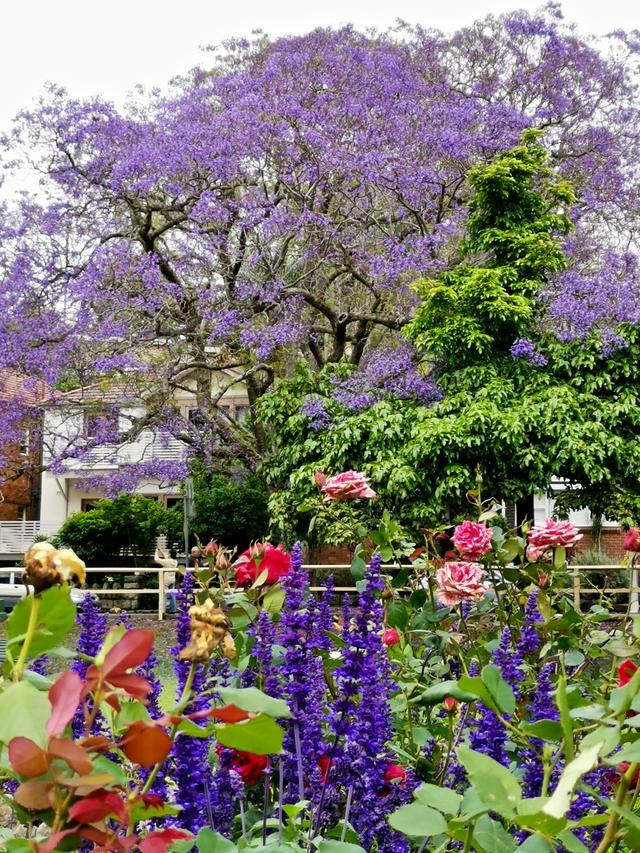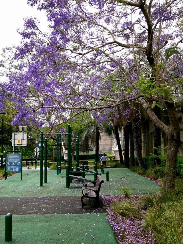 我在悉尼CBD,到花街要穿过海港大桥,一看距离不过3-4公里,便决定腿儿着去,健身又看风景。果不其然,路上就看到了蓝花楹。这是在一个街区健身运动区,旁边有两棵蓝花楹树,雨打花落满地花瓣,很美是不是。