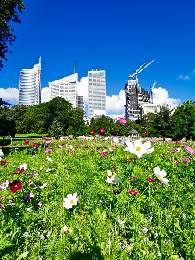这片草花园地也已经怒放,摇曳的花朵映衬着远处的市中心大楼。