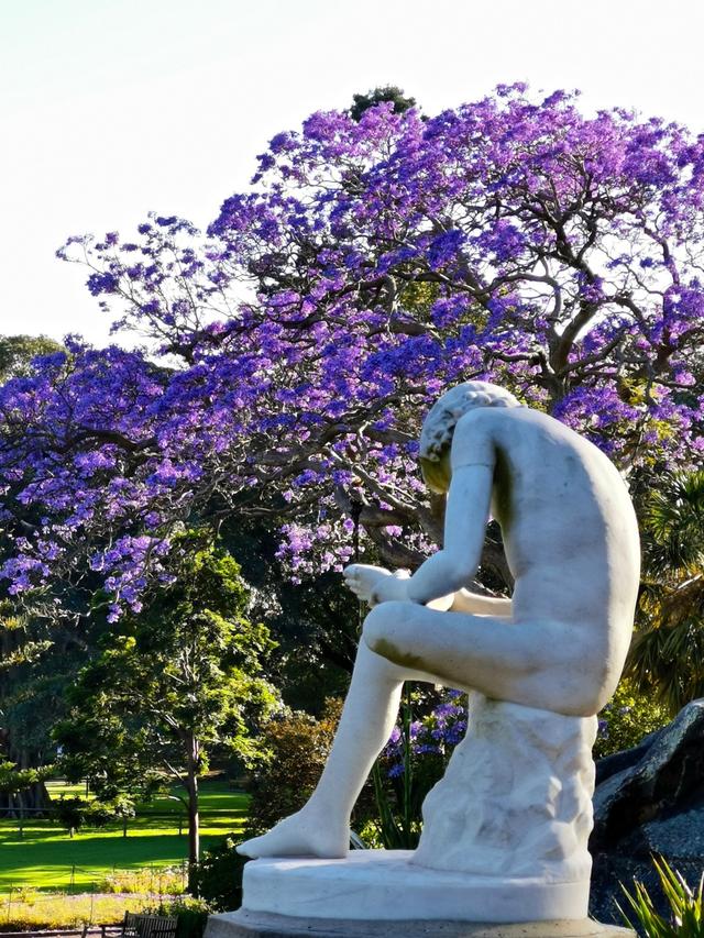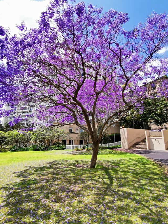 11月的悉尼全紫了!到处是盛开的蓝花楹,树上是紫色云霞,树下是落英缤纷,怎一个美字了得。蓝花楹(Jacaranda)的花语是在绝望中等待爱情,在这浪漫的紫色世界里似乎真就酝酿出无数爱情。行走在路上不时被路边冒出来的紫色蓝花楹晃到了眼睛,禁不住停下脚步欣赏这紫色的风景。
