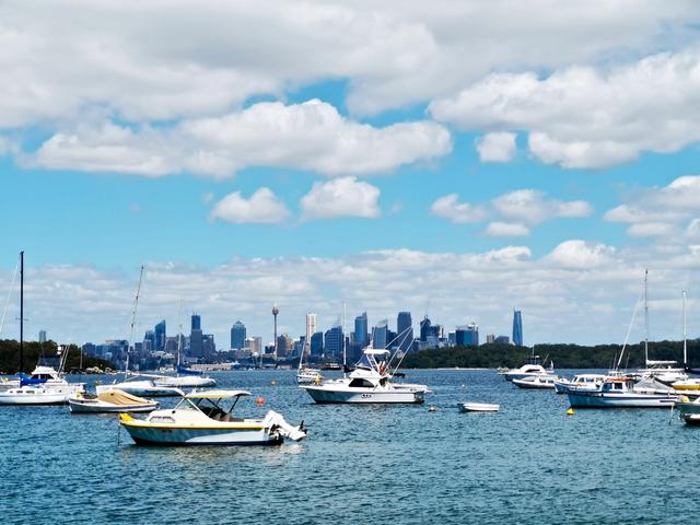 这里离悉尼市中心不过10公里,从Watsons Bay回望悉尼,前景是停泊的小船蓝蓝的海水,远处是城市天际线,天空飘着朵朵白云,美如海市蜃楼。