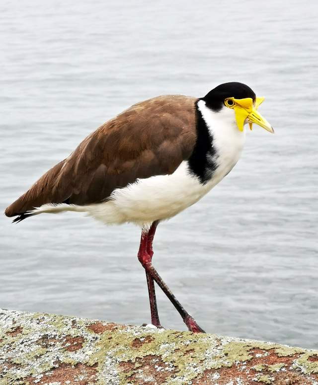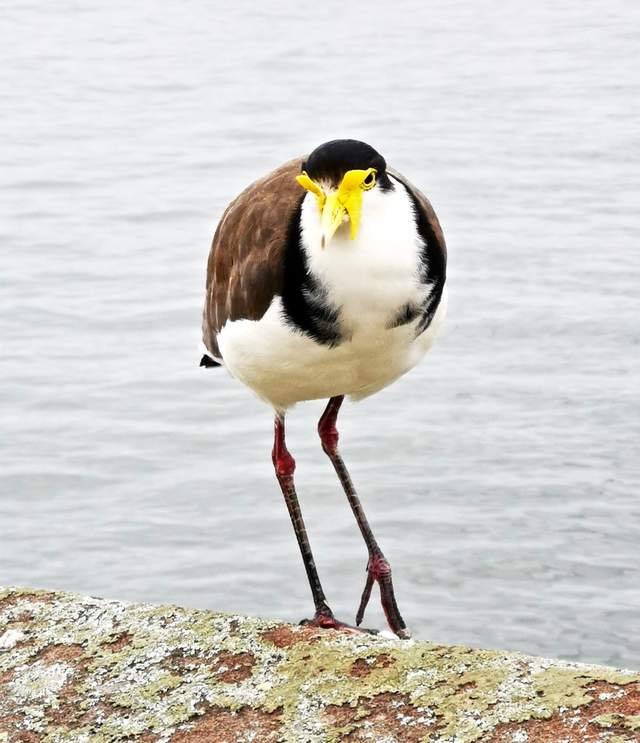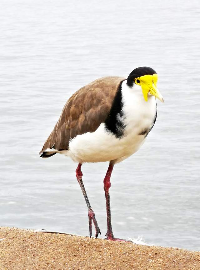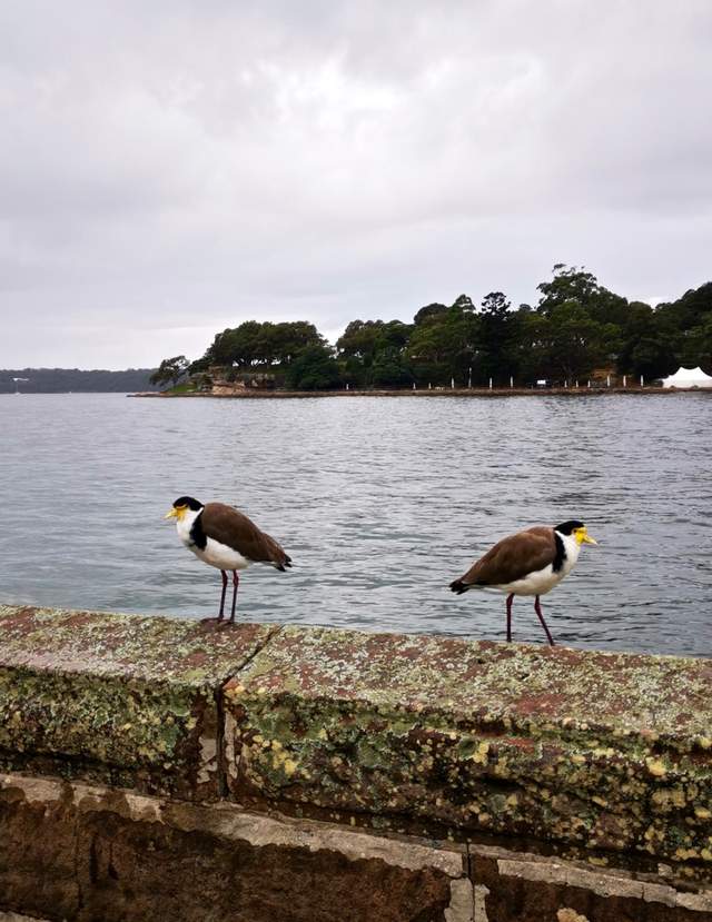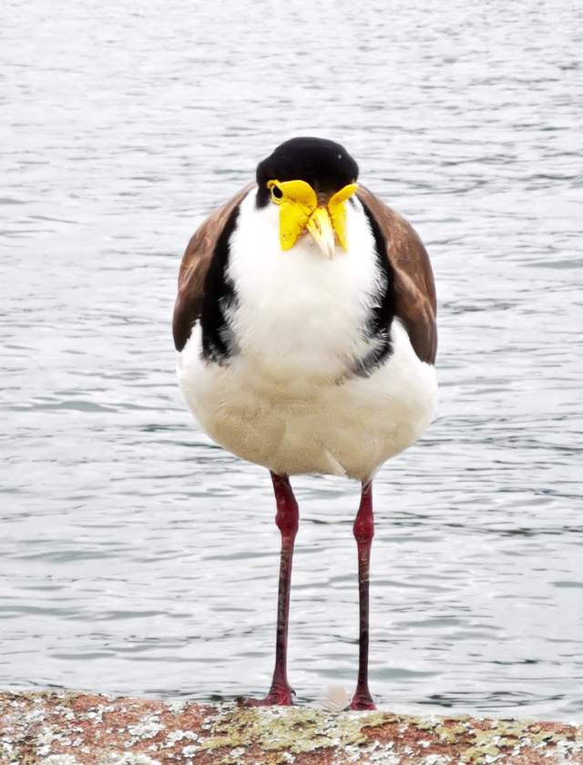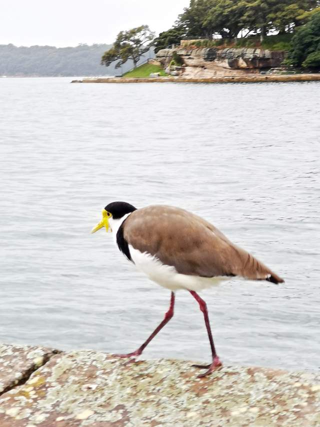 这是澳大利亚最常见的鸟类之一,中文名叫白颈麦鸡。因为它的脸像是贴了两片黄黄的榴莲,所以有人戏称它们为“榴莲鸟”。