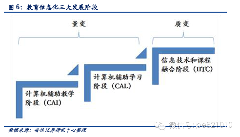 教育信息化可以分为三个阶段:计算机辅助教学阶段、计算机辅助学习阶段、信息技术和课程融合阶段。每个阶段信息化的侧重点各有不同:计算机辅助教学和辅助学习阶段,主要强调学生从被动学习到主观能动性的发挥,鼓励学生利用信息技术主动参与学习;信息技术和课程的融合阶段则重视利用信息技术营造理想的学习环境。