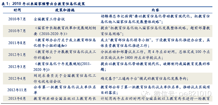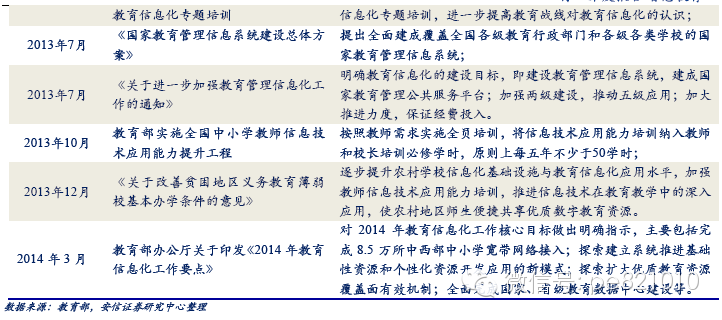 2014年1月,中国电信与教育部在北京签署战略合作框架协议,根据协议,今后三年中国电信和教育部将在教育信息化基础设施建设、教育管理信息化和数字教育资源服务、教育信息化教师与专业队伍培训等领域开展多种形式的合作;重点支持中西部10-15万所中小学的宽带网络接入和已实现宽带接入的8-10万所中小学校园无线网络建设,并对这些学校的日常网络使用费给予特殊优惠。与此同时,各地区也陆续开始采购班班通和两平台系列产品,“三通两平台”的建设正在稳步推进中。
