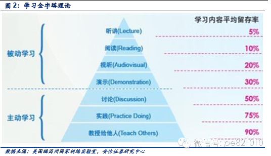 教育信息化引导学生从被动学习到主动学习,提升学习效果。美国缅因州国家训练实验室的研究结果显示,在传统教育体系下照本宣科的听讲方式下,学生的学习内容平均留存率仅为5%,学习效果较差。而通过视听、演示、讨论等体验式的学习,给学生留下“刻骨铭心”的记忆,更容易激发起学生的学习兴趣。目前,越来越多的教师选择通过“多媒体演示”的方式教学,例如在语文课《三国演义》教学中播放电视剧情节,在物理课《天体运动》中插入太阳系运动轨迹动画,这种教学方式给予学生更加直观的感受,增加其对知识的理解。此外,一些学校开始鼓励学生利用信息技术自主搜集资料、讨论和分享,这种通过计算机引导学生主动学习的方式进一步提升了学习效果。