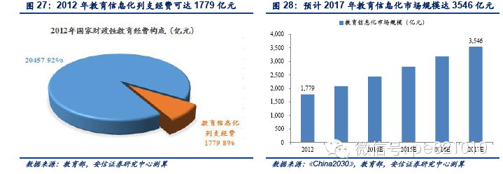 教育信息化激发千亿市场空间。2011年6月,教育部发布的《教育信息化十年发展规划(2011-2020年)》(征求意见稿)明确提出各级政府在教育经费中按不低于8%的比例列支教育信息化经费。按照2012年国家财政性教育经费22,236亿元的规模测算,教育信息化列支经费可达1,779亿元。目前,国家相关部门正在积极探索建立教育经费购买数字教育资源和信息化服务的长效机制。我们根据世界银行、财政部和国研中心联合发布的《China2030》中的GDP预测数据,以及国家财政性教育经费占GDP的历史数据为基础,预计2017年我国教育信息化市场规模将达到3,546亿元。