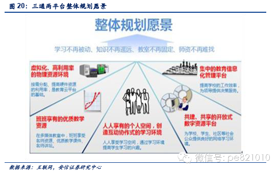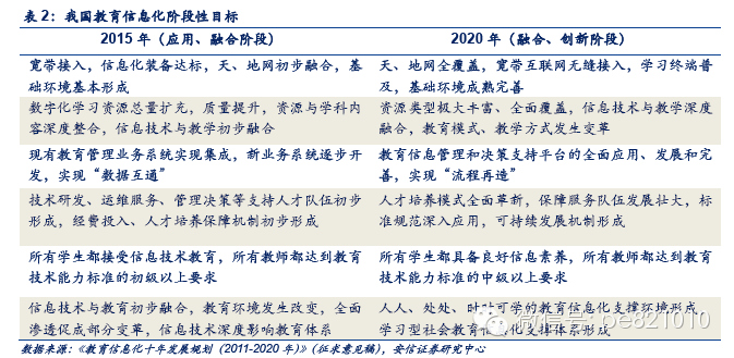 从建设规划来看,《教育信息化十年发展规划(2011-2020年)》提出实施“中国数字教育2020”行动计划,在优质资源共享、学校信息化、教育管理信息化、可持续发展能力与信息化基础能力等五个方面取得实质性重要进展。