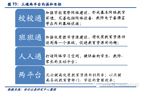 “三通两平台”是现阶段教育信息化的建设重点。2012年9月,教育育部副部长杜占元在全国信息化工作会议上首次提出“三通两平台”,即宽带网络校校通、数字资源班班通、学习空间人人通,教学资源公共服务平台和教育管理公共服务平台。《2014年教育信息化工作要点》明确提出,推广“中心学校带教学点”的教学组织模式,形成“一校带多点”“一校带多校”的模式,探索构建利用信息化手段扩大优质教育资源覆盖面的有效机制,三通两平台建设将是解决我国教育资源分配不均问题的重要手段。