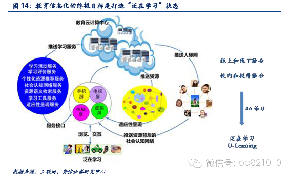 “泛在学习”阶段,K12在线教育市场将井喷。我们在上一篇报告《互联网开创教育发展新纪元》中,提出我国线上K12课外辅导的发展速度较为缓慢,原因在于网络环境尚未完善和家长对在线教育存在戒心。在“泛在学习”的智慧学习生态形成后,所有学习空间将被打通,学校和家长对在线教育的态度更加开放,K12阶段的在线教育市场将井喷。考虑到我国K12阶段的学生数量庞大,线下向线上转化的空间将十分可观。