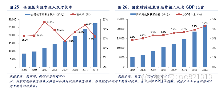 根据教育部公布的数据,过去十年,我国国家财政性教育经费占GDP的比重稳步提升,从2005年的2.8%上升到2012年的4.3%。2012年,全国教育经费总投入达到27,659亿元,同比增长16.0%;国家财政性教育经费投入22,236亿元,同比增长19.6%,充分表明国家对教育的重视程度正在不断提升。