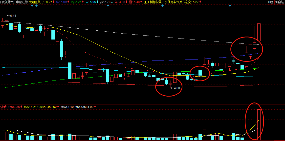 很多人对于券商股充满迷茫,不知道该如何去选择其中的机会。我一直讲,要遵循大道趋势理论特别是大道七线的法则,而不是简单的根据业绩选择个股。举个例子,昨日公布的31家券商6月营收情况看,中原、国信和银河,是仅有的几家环比呈现负增长的公司,居然在今日的券商股中,表现出奇靓丽,领涨所有券商。而营收和净利润双丰收的国泰君安、广发、海通和申万宏源,其走势要远远弱于上面几家公司。从基本面的角度你打破脑袋也想不明白,但是从技术走势上看,就相当简单了。以中原证券为例,其7月4日开始,便悄然放量酝酿向上冲击,特别是在冲击中长期重要阻力位大道卯线时,量能更是不断放大,昨日在市场全面大跌的时候更是一举突破并站稳卯线,那今日的大阳则是水到渠成不在话下了。注意,这里讲解的个股并非是推荐,而是告诉大家,技术面选股及操作的精髓是什么。这个东西学会了,无论市场如何变幻,你自是闲庭信步,对待机会也是游刃有余。