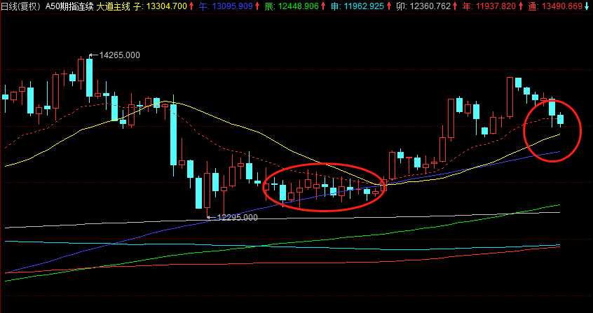 看明白这一点,再来看目前的沪指,就能通透很多。我昨天说过2945点是大道子线位置,这里已经是连续第二个交易日失守了,如果明日还不能收复,则调整会加深一些,但下方的强支撑——大道申线和大道辰线并不太远,所以最多到2865点,就会是更强的支撑。所以,这里最坏的打算也不过就是构筑一个大的头肩底形态,不会有太过恶劣的情况出现。而一旦A50因为回踩到子线位置转身向上,则大盘也会随时扭转颓势反身向上的,甚至在A50触底回升的带动下强势收复大道子线希望一样很大。