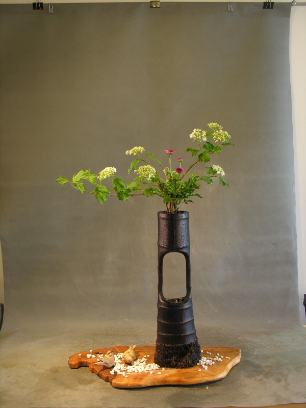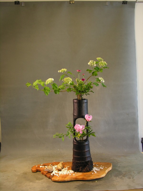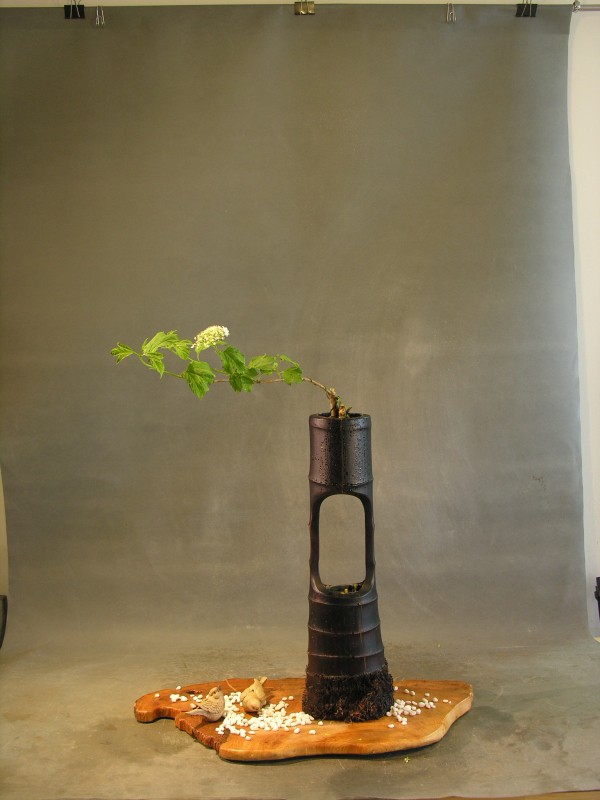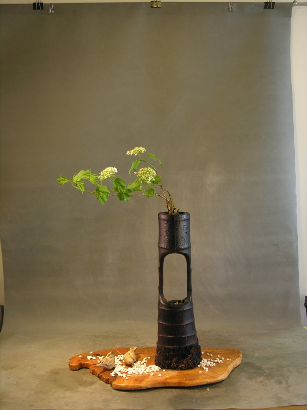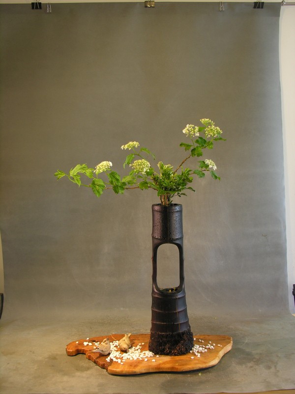由于筒本身为瘦长型,看起来较不稳定,因此,取材时,以线条较轻盈而明快的材料较合适,如菝契、猕猴桃、小手球、八仙花、笑靥花等等。”