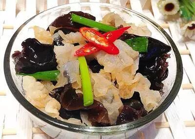 黑木耳、银耳各150克,青椒1个,胡萝卜1根, 盐、白糖、香油、蒜末各适量。