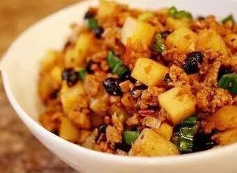 2.油锅烧热,投入猪瘦肉丁速炒,待肉丁变色后,加入红薯丁煸炒至半熟,加入酱油、盐和适量清水,盖锅焖烧片刻,用水淀粉勾薄芡即可。